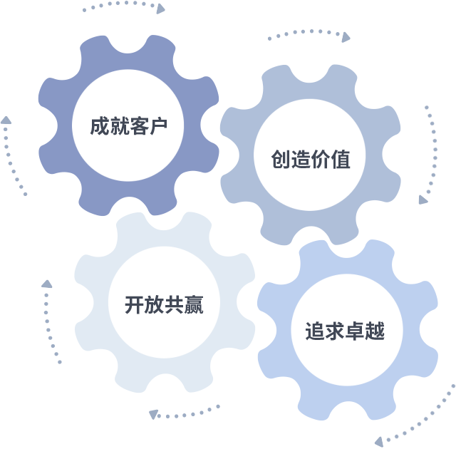 成就客户是一切决策的出发点,创造价值是衡量所有工作的标准,追求卓越是尊龙在线登录做事做人的态度,开放共赢是尊龙在线登录的格局也是最终的结果。价值观的齿轮环环相扣,推动着组织里的每个人不断向前。